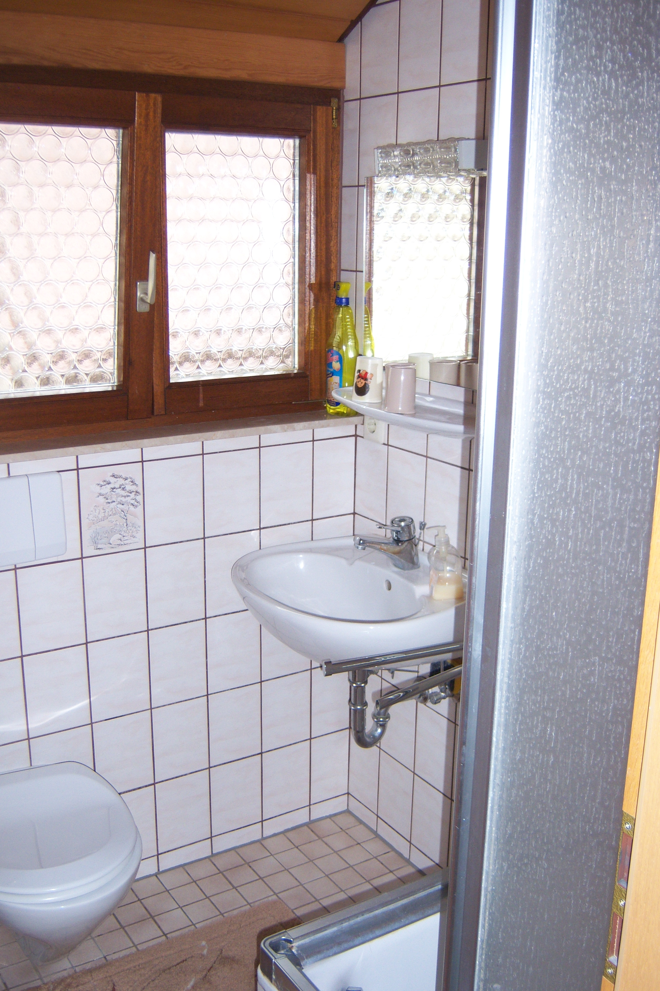 Das Badezimmer hat eine Dusche Waschbecken und Toilette