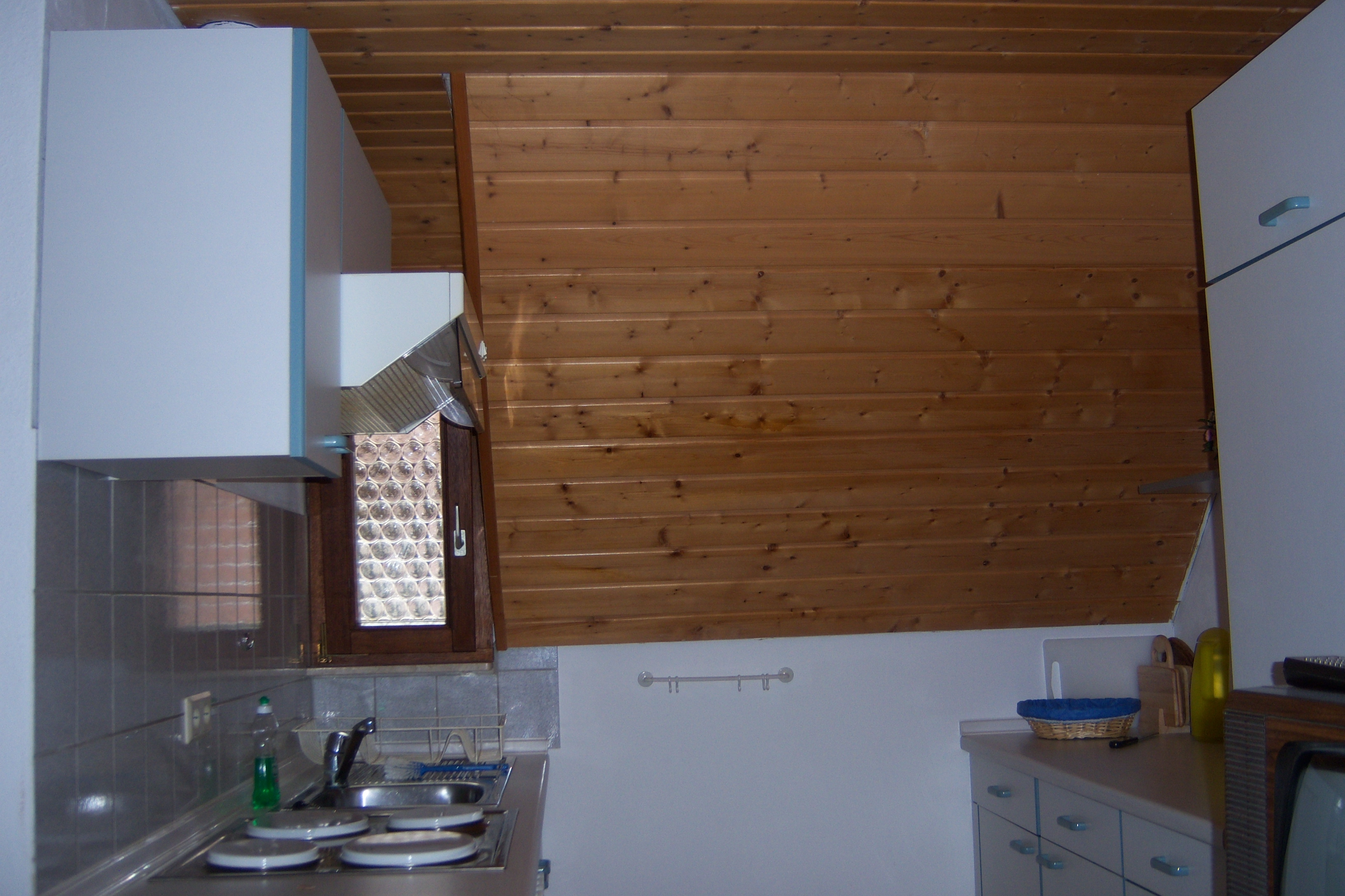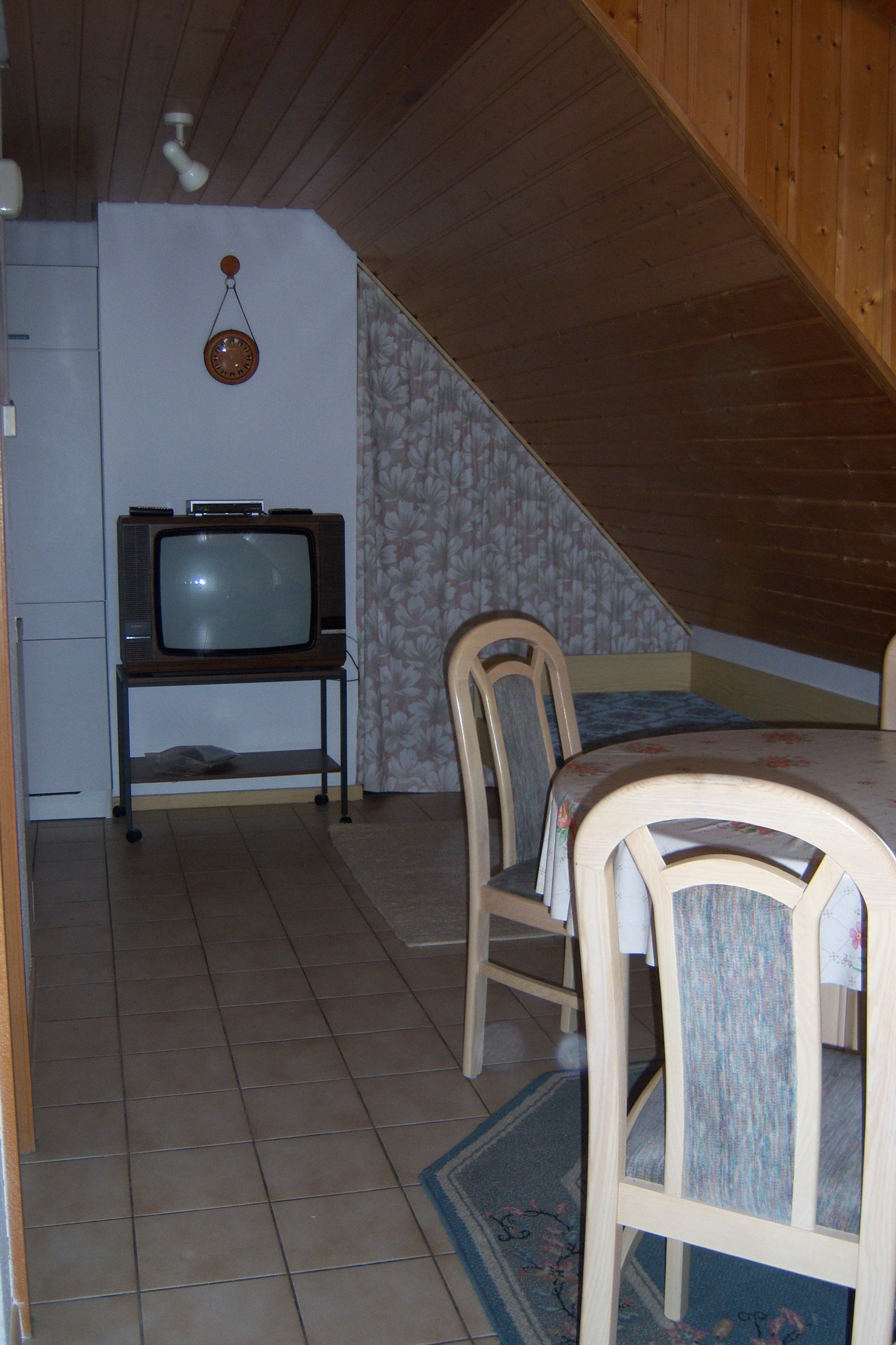 Die Wohnküche ist sehr geräumig und hat einen Esstisch.