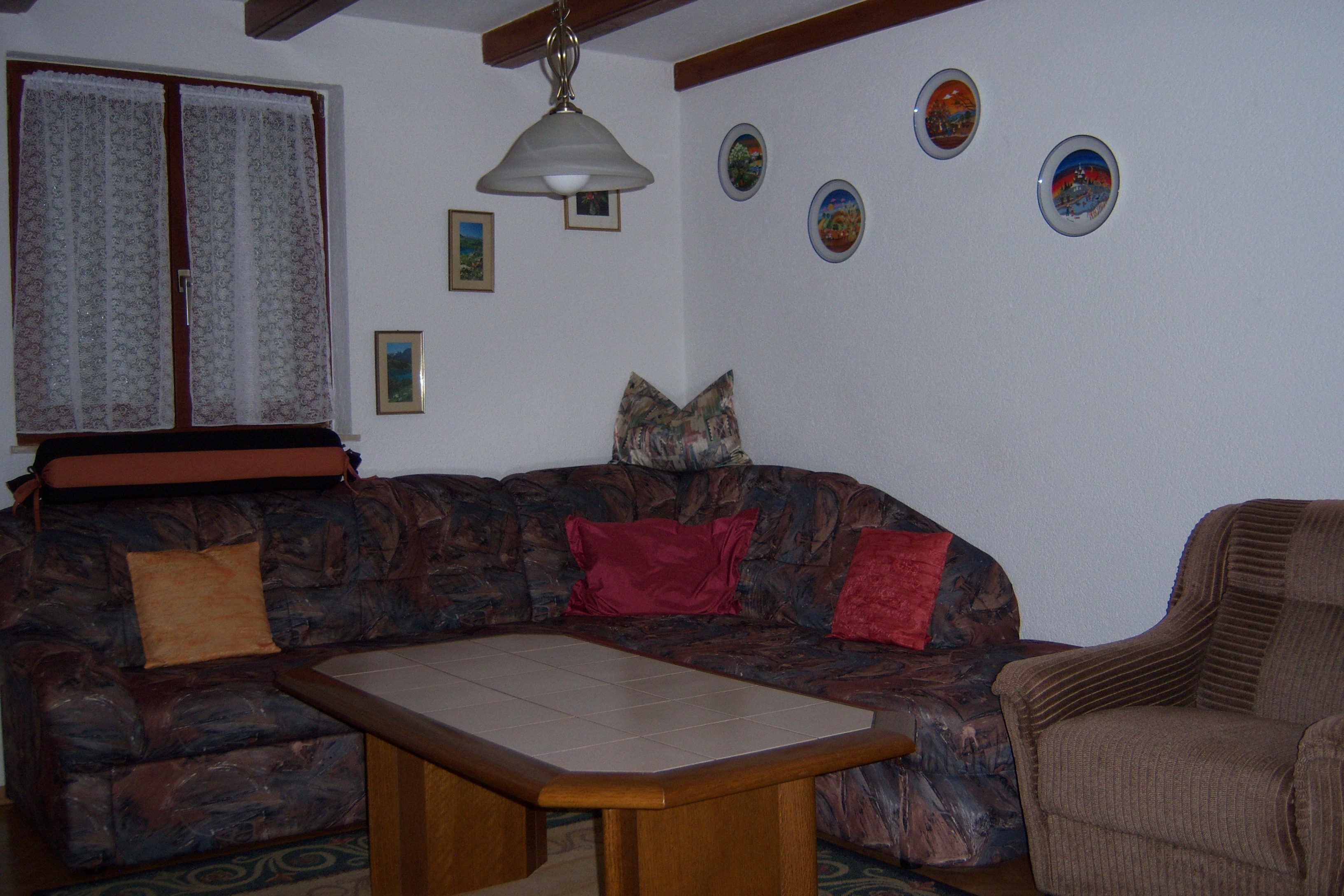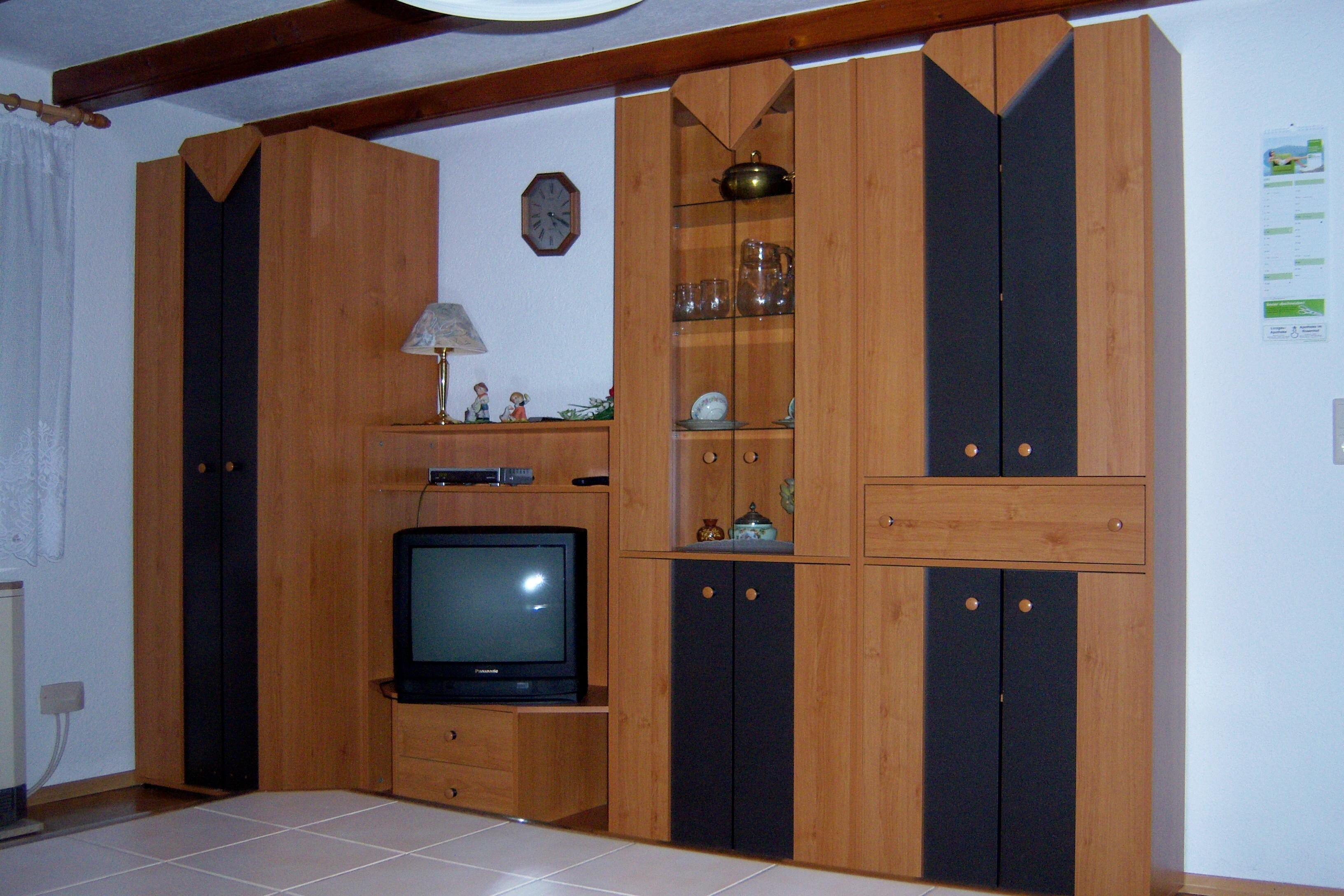 Das Wohnzimmer ist mit einer Polstergarnitur, einem Sessel, Wohnzimmertisch und einer Wohnwand ausgestattet. In der Wohnwand befindet sich der Fehrnseher mit Satelitenresiver.